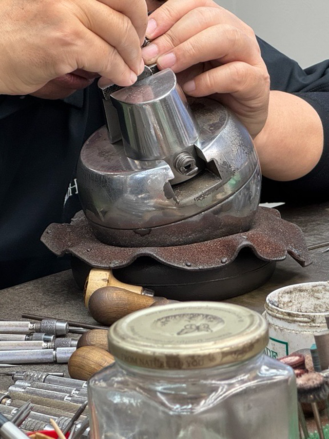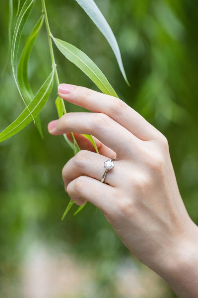 0.5/0.7/1.0ct それぞれで爪角度・石座高・重心を最適化し、ダイヤの光が最短距離で立ち上がるよう面の揃えを徹底しています。